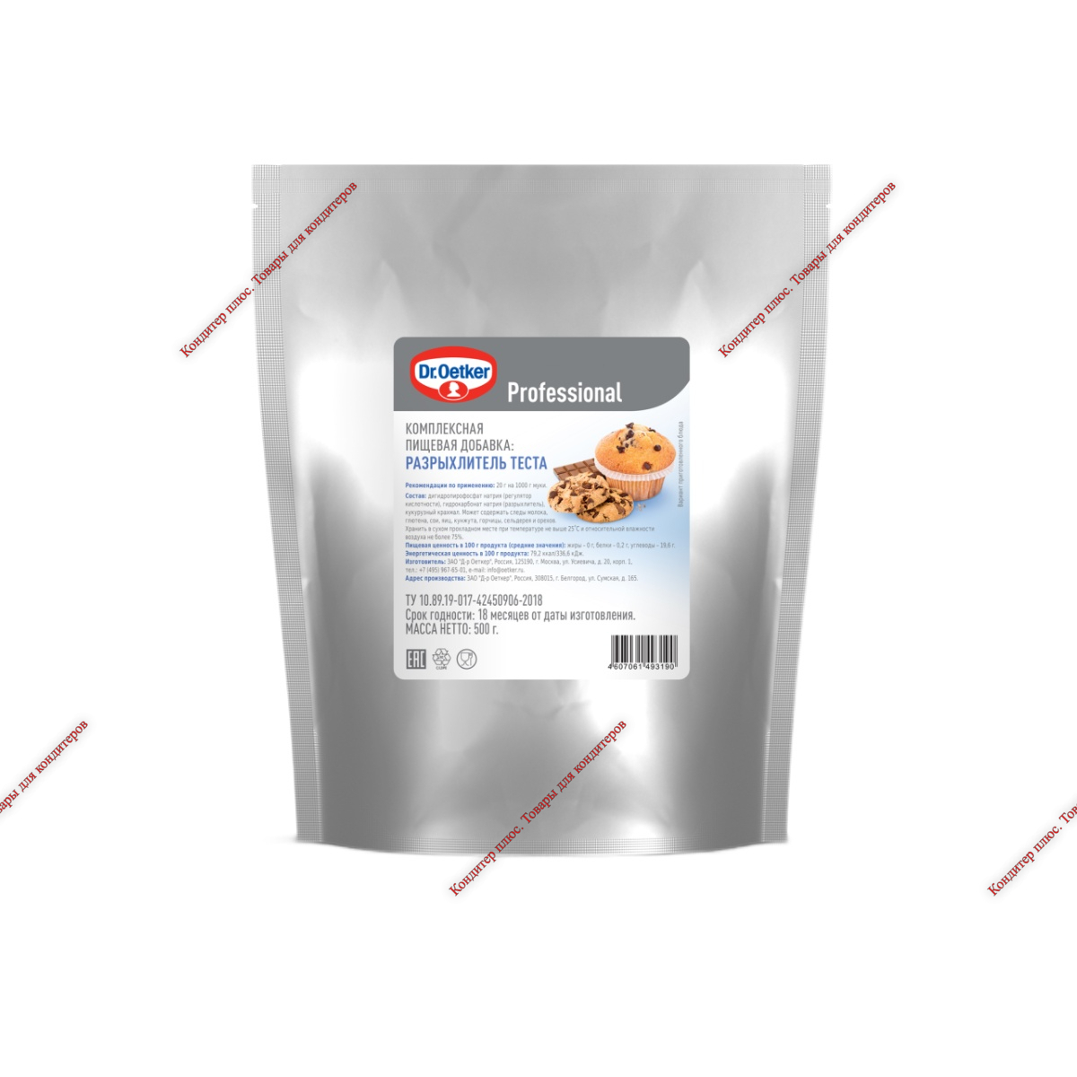 Профессиональный разрыхлитель для теста Dr. Oetker Professional / Dr. Bakers хорошо известен и любим профессионалами и любителями выпечки. Чаще всего используется при приготовлении кексов, маффинов, вафель, тортов и бисквитов, песочных пирогов и печенья, а также блинов, панкейков и оладий. ... Страна производства. Россия. Энергетическая ценность калории (на 100 гр.) 79.2 ккал.